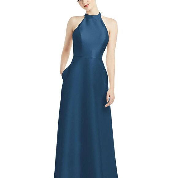 A full length, satin twill dress with pockets make a nonchalant, carefree statement. A plunging open back and high banded neckline along the halter adds a sophisticated finish.