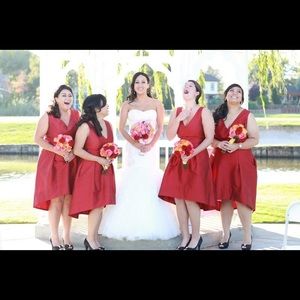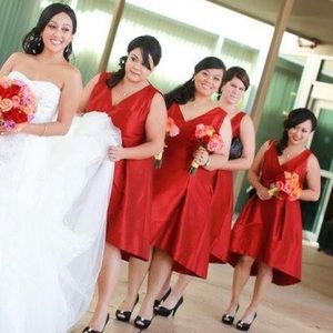 I am 5 ft 0 in and this dress has been altered to knee length. This is a beautiful hi-low dress. Cocktail length v-neck dupioni dress. Worn once for wedding and still in great condition. Style d586 - color Barcelona.