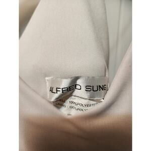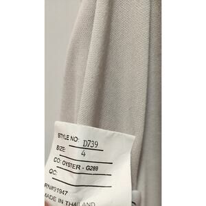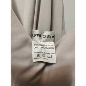 The product is a beige, sleeveless, and long formal bridesmaid dress designed by Alfred Sung, known for their quality and elegant designs. This dress is a size 4, making it suitable for women who are looking for a sophisticated and chic option for formal events or weddings. With its sleek design, side zip, and neutral color, it is a versatile and elegant choice that can complement various styles and themes.