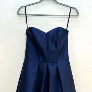 Alfred Sung D699 Strapless High Low Satin Gown Color: Midnight Blue Size: 16 Lustrous satin illuminates the contemporary high/low silhouette of a strapless dress fitted with princess seams, a fitted waist and full ballgown skirt. 44" regular length Hidden back-zip closure Sweetheart neck Strapless Side-seam pockets Removable belt High/low ballgown skirt Lined 100% polyester Dry clean Imported *The dress is New. It is Floor Model, item may have been tried on*