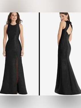 Alfred Sung high-neck maxi dress in Midnight navy blue features a sophisticated trumpet silhouette crafted from smooth sateen fabric. The elegant bodice is designed with a jewel neckline and a dramatic open back accented by a charming oversized bow detail at the nape. A concealed back zipper and hook-and-eye closures ensure a seamless fit, while the flared skirt provides graceful movement for formal occasions, bridesmaids, or black-tie events.