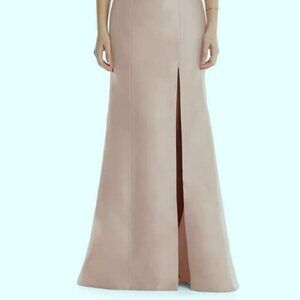 Become a vision of elegance in this twill satin gown that features a dramatic split down the front and a diamond-shaped cutout with a chic bow on the back.