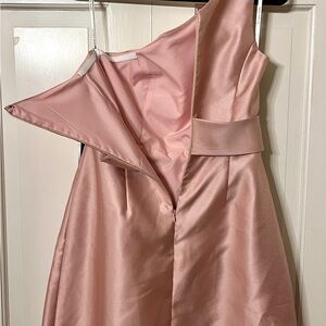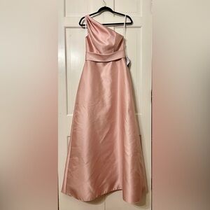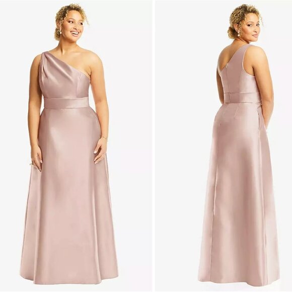 Alfred Sung Draped One-Shoulder Satin Maxi Dress Pockets Toasted Sugar 4 AS IS