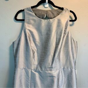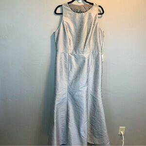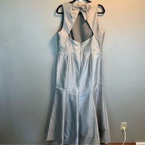 A shimmering stunner, this dupioni full-length sleeveless dress elegantly exudes sophistication with a full flared trumpet skirt and lovely silhouette. A jewel neckline highlighted by a playful bow accent flows gracefully into a diamond cut out open back.