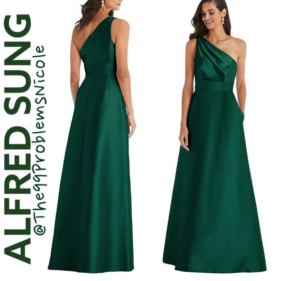 Alfred Sung Satin A-line Gown with Pockets and Draped One Shoulder in Dark Green
