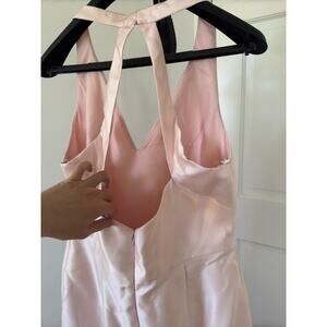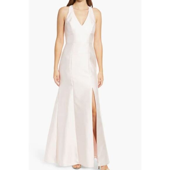 Lustrous satin captivates with every move, and even when perfectly still, on this halter-style gown with a movement- and allure-enhancing thigh-high slit.