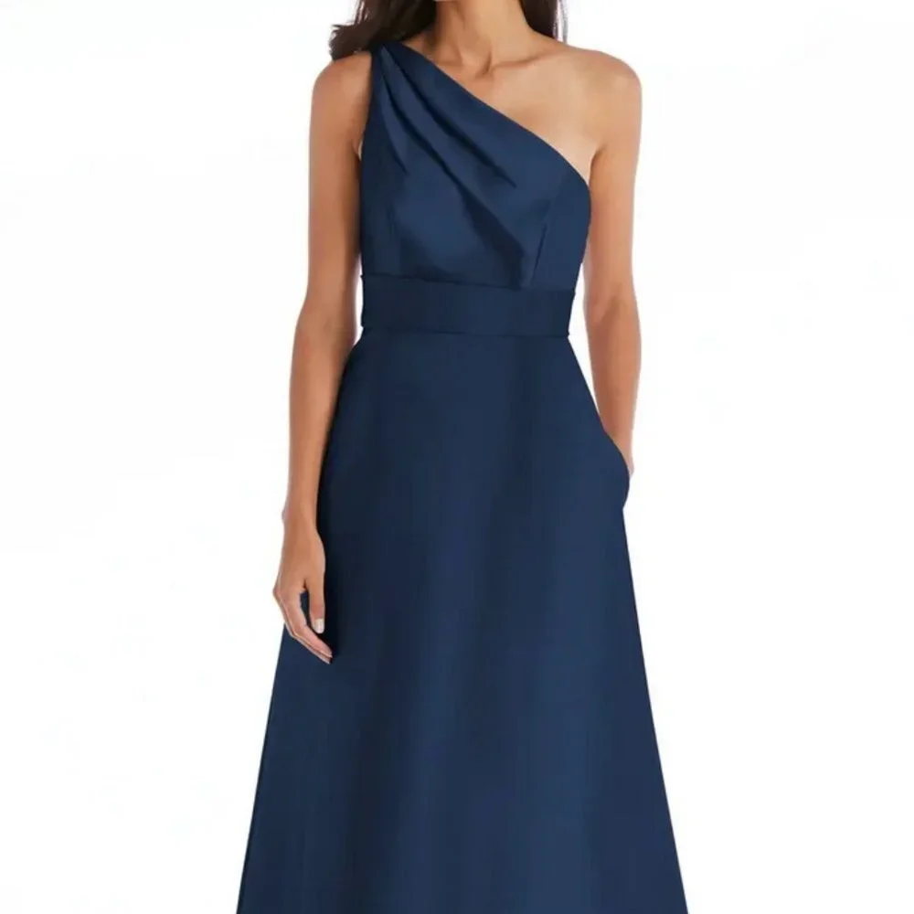 Elegant and captivating, this one-shoulder satin gown features a pleated draped bodice that's emphasized by a matching sash at the waist and handy pockets.
