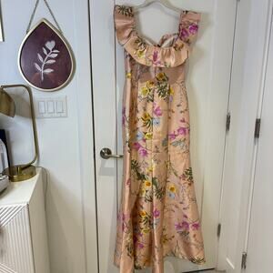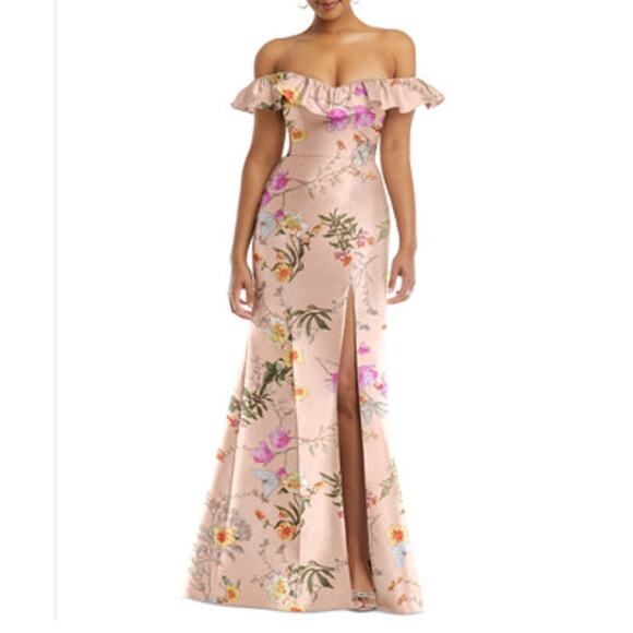 Alfred Sung Off the Shoulder Pink Satin Floral Trumpet Gown Medium