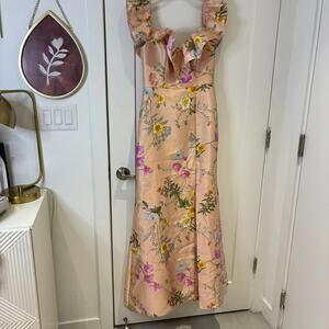 This lustrous floral satin twill gown is a must-have for any special occasion. The soft sweetheart neckline trimmed with ruffles adds a flirty, feminine vibe. While the sleek floor-length trumpet skirt with slit has a polished, flair that will make you stand out.