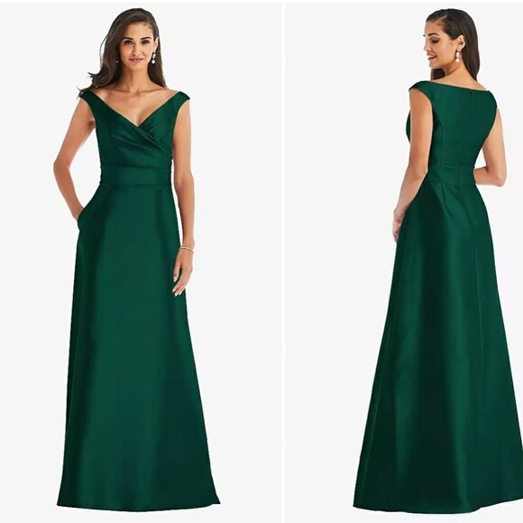 Alfred Sung, Off-the-Shoulder, Draped, Wrap, Satin, Maxi Dress, Gown, Formal, Bridesmaid, Hunter Green, Evergreen, Emerald, A-line, Pockets, Wedding, Special Occasion, Prom, Gala, Evening Dress, Black Tie, Holiday Party, V-neck, Sleeveless, Cap Sleeves, Elegant, Classic, Timeless, Dark Green, Forest Green, Jewel Tone, Silky, Lustrous, Smooth, The Dessy Group, Military Ball, Cocktail Dress, Dance, Back Zipper, Full Skirt, Mother of the Bride, Mother of the Groom, Classy, Gorgeous, Floor Length, Long Dress