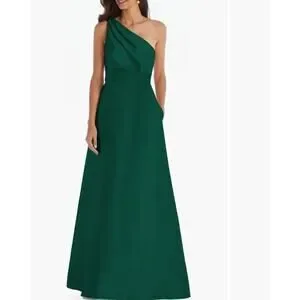 Alfred Sung Gown, Hunter Green Bridesmaid Dress, One Shoulder Formal Dress, Satin Evening Gown, Plus Size 16 Formal, Wedding Guest Dress, Prom 2026, Military Ball Gown, Emerald Satin Dress, A-Line Maxi Dress, Dress with Pockets, Designer Black Tie, Forest Green Gala Dress, Dark Academia Aesthetic, Winter Wedding, Elegant Evening Wear.