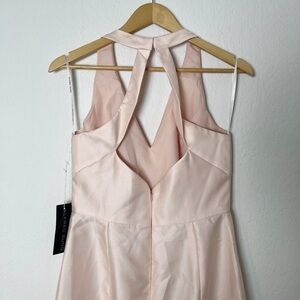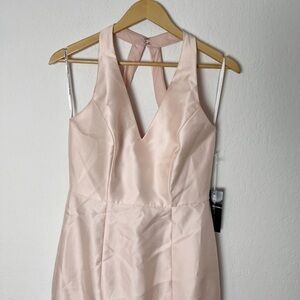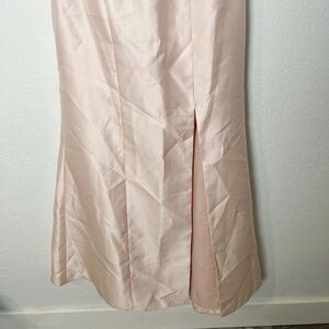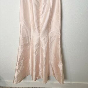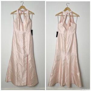 full-length dress with a modifier halter V-neck silhouette. Graceful on a formal occasion, the gown boasts a beautiful trumpet skirt highlighted by a long, daring side slit.