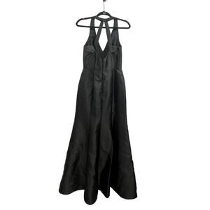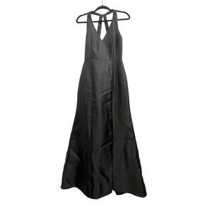 Alfred Sung Solid Black Satin Trumpet Gown Maxi Thigh-Slit Sample Dress 8
