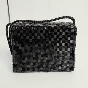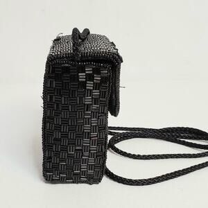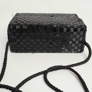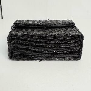 GUC: Classy, black beaded square formal evening shoulder/crossbody bag with an allover glass bead design/front flap magnetic closure/braided woven shoulder strap/black 100% rayon lining by Alfred Sung. In great pre-owned condition. **Disclosure: there are several loose/missing beads/front decorative tassel is almost all gone. Please see pictures.