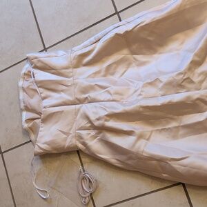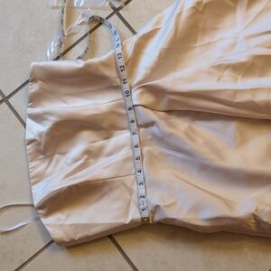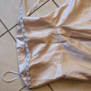 Alfred Sung style D832 Strapless Maxi Dress Satin Gown with Draped Front Slit and Pockets in Champagne gold silver beige off white. Size 6 please see measurements pictures to be sure of fit. Retail: $252