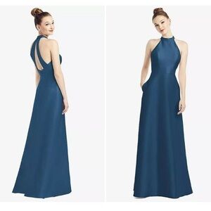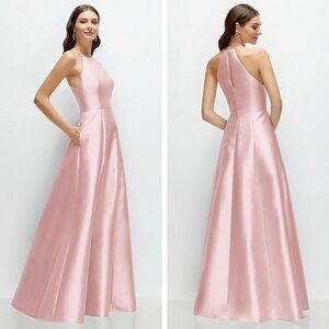Draped one shoulder satin twill maxi dress with pockets from Alfred Sung. Elegant. Timeless. Effortlessly chic.