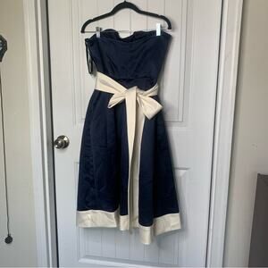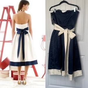 Tea length strapless bridesmaid dress in Duchess Satin has inverted pleats at the natural waist and pockets in the side seams. The sash and hem can match the main color of the dress or add a splash of contrast.