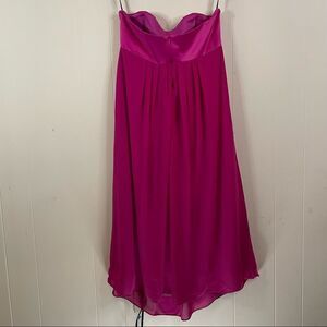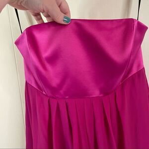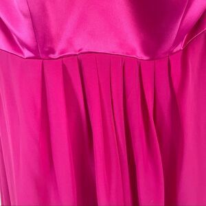 This cute bridesmaid’s dress is in excellent pre-owned condition. The top is satin and the empire waist is pleated chiffon on the front and back. The dress should fall at mid-calf. The top has some light boning in the top as well. The color is called “American Beauty”. This dress is perfect for a spring/summer wedding, engagement party, or for a wedding guest! It does not appear that this dress was altered, but measurements are below.