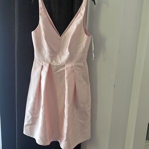 Cocktail length sleeveless satin twill dress with v- neckline. Pleated skirt with pockets.