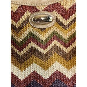 ~ Cream faux leather with a basket woven zig-zag design with brown, yellow, & cream