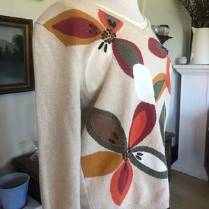 Beautiful sweater top by Alfred Dunner featuring large flower design and beaded embellishments at the iris of each flower. It’s in new condition and with original tags.