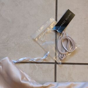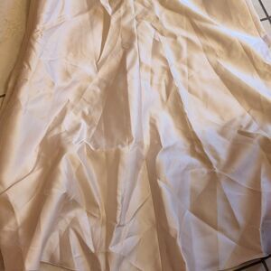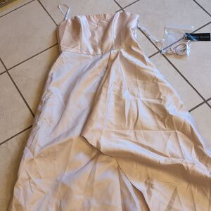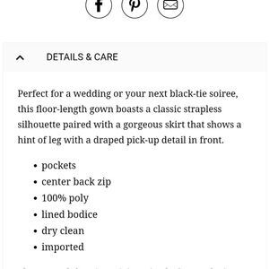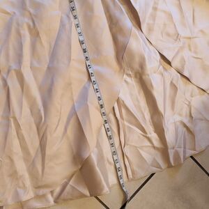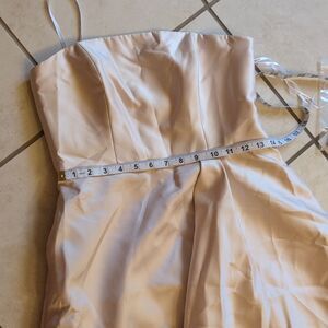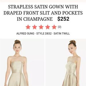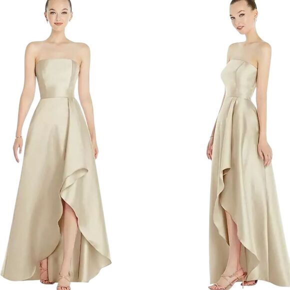 Alfred Sung style D832 Strapless Maxi Dress Satin Gown with Draped Front Slit and Pockets in Champagne gold silver beige off white. Size 6 please see measurements pictures to be sure of fit. Retail: $252