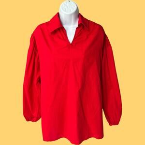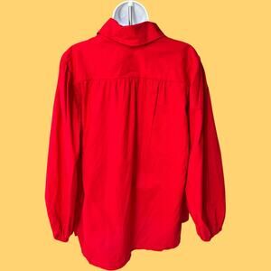Peasant-style long-sleeve blouse in vibrant red with a relaxed fit, split-collar neckline, gathered shoulders, and elastic cuffs. Crisp cotton-feel fabric. Vintage 80s/90s minimalist/boho. Solid color. Condition: Good vintage.