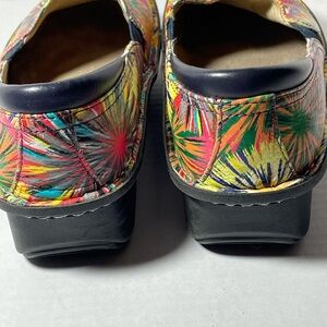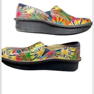 Classic Alegria shoe with the added benefit of a fully enclosed back to protect your heels, stain-resistant upper so clean-up is easy, and a slip resistant PU outsole designed for safety as well as pain relief for your feet, legs and back. Fireworks is made from a printed leather in a blue, multi-tonal pattern sure to match your wardrobe. All signs of wear shown in pictures. size 37