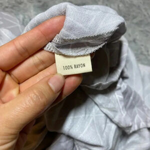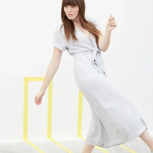 Wrap dress in grey/white print with plunging neckline and extra long tie for closure in front or back. Length hits just above ankle. Looser fit on top as seen in model and actual photos. Made with love in California.100% Rayon