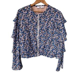 Blue floral printed crepe (100% Polyester). Jacket. Long sleeves with tiers. Exposed front zipper. Fully lined. 22.5" from shoulder to hemline. 20.25” pit to pit