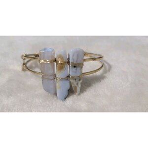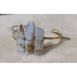 This bracelet features a sophisticated design with howlite stones wrapped in a gold-tone cuff. Ideal for adding a touch of elegance to any ensemble. Its adjustable nature ensures a comfortable fit for various wrist sizes, making it a versatile addition to any jewelry collection.