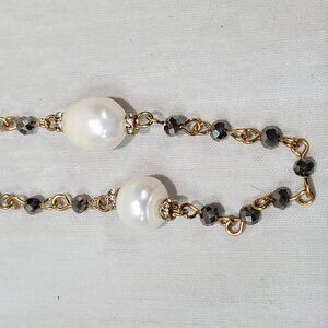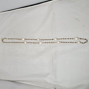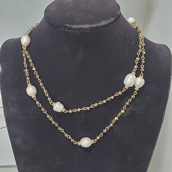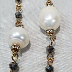 ALI KHAN elegant long necklace crafted in gold-tone metal, featuring a delicate chain accented with luminous baroque-style pearls and subtle rhinestone stations for added sparkle. The evenly spaced pearls create a refined, timeless look, while the elongated 36-inch length allows for versatile styling—wear it long or doubled for a layered effect. Finished with a secure lobster claw closure, this necklace is perfect for effortless everyday elegance or dressing up both casual and evening ensembles.