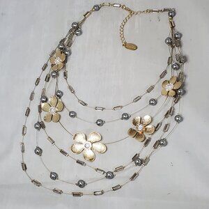 Ali Khan multi-strand necklace is a charming and elaborate piece featuring six layers of gold-toned strands adorned with a mix of beads and prominent gold-toned floral accents. It offers a layered and intricate look, perfect for adding a touch of elegance with a botanical theme.