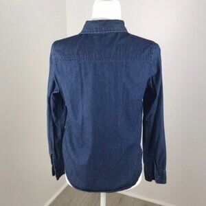 In good pre-worn condition! Material is very soft but not very stretchy. Sleeves can roll up and button. 100% cotton. There’s also a small line across the front of the shirt.