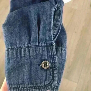 In good pre-worn condition! Material is very soft but not very stretchy. Sleeves can roll up and button. 100% cotton. There’s also a small line across the front of the shirt.