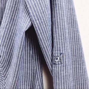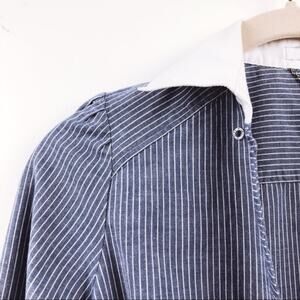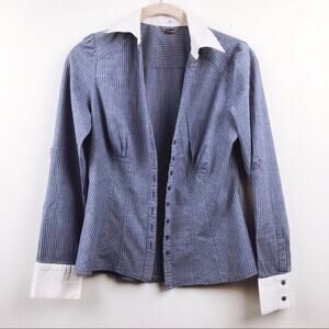 Elevate your wardrobe with this stylish Ali & Kris fitted button-up shirt. Featuring classic blue and white stripes, a deep V-neckline, and crisp contrasting white cuffs and collar, this top is perfect for both office wear and casual outings. The tailored fit and button-down design add a chic, sophisticated touch.