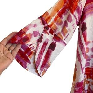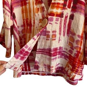This jacket is SO fun!! 100% linen from Ali Miles. Vibrant pink & orange watercolor pattern throughout. One single large button closure and really fun flared, scalloped hems on the sleeves. Size Petite Medium. In EXCELLENT preowned condition; no visible flaws!! Ali Miles is such a fun artsy, lagenlook brand and this is one of my favorite pieces!