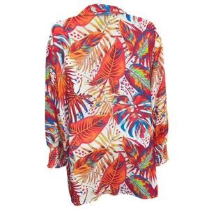 The Ali Miles 2X Top is a colorful tropical floral blouse with a collared neckline and puff sleeves with smock cuffs. This pullover top is made from lightweight polyester material and features vertical trim accents. It is suitable for travel, casual, and business occasions, offering a versatile and stylish design for winter, fall, and spring seasons. Personalization is available with armpit to armpit measuring 26" and shoulder to hem measuring 29". Easy to care for with machine washable instructions, this blouse offers both style and comfort for plus size women. The original price tag is $74!