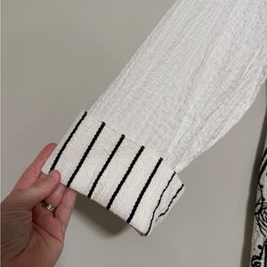 Discover the unique charm of this Ali Miles top, featuring a boxy silhouette with an asymmetrical design. The 3/4 cuffed sleeves and mandarin collar add a touch of sophistication, while the black and white color palette ensures versatility. Perfect for making a statement, this shirt combines modern style with artistic flair.