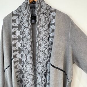 Beautiful Ali Miles open-front cardigan jacket featuring a soft gray knit body with a lace front panel.