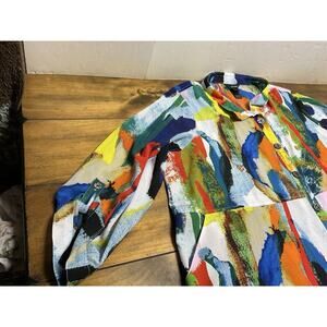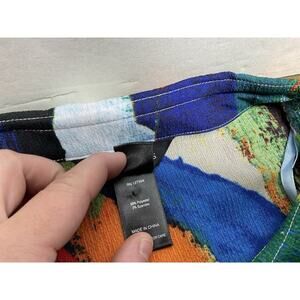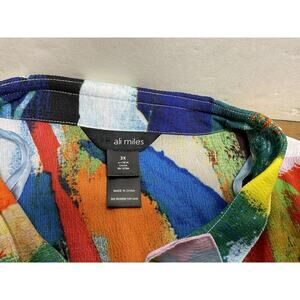 The Ali Miles Multicolor Abstract Print Blouse in 3X size is a stylish and versatile piece perfect for casual occasions. Made from polyester spandex knit fabric, this blouse features a collared neckline, 3/4 sleeves, and a pullover closure for ease of wear. The abstract print in various colors adds a unique and artsy touch to the basic style, while the wired collar accent gives it a trendy flair. This blouse is designed for a regular fit, offering comfort and stretch for all-day wear throughout the seasons of winter, summer, fall, and spring. Ideal for women looking for a chic and fashionable top to add to their wardrobe.pre owned good condition we ship fast measurements are in the pictures