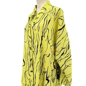 Ali Miles NWT Crinkle Crepe Neon Yellow & Black Abstract Wired Collar Tunic Top