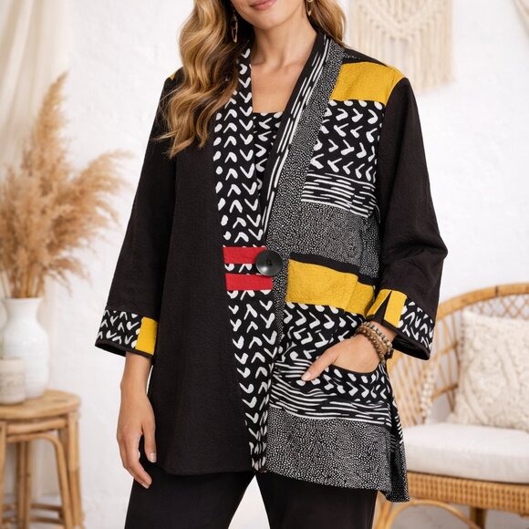Bold Ali Miles art-to-wear blouse featuring graphic patchwork panels in black, white, yellow, and red. Textured stretch fabric with a creative drape, button-front closure, and 3/4 sleeves.