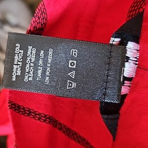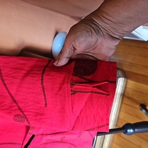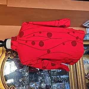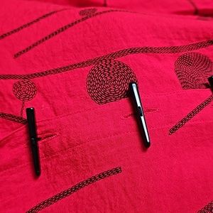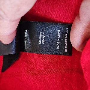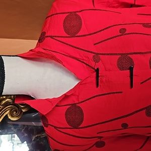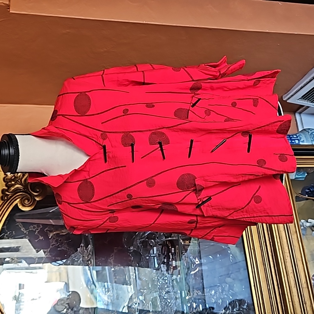 Red and black large poppy print, stand up collar, interesting buttons black plastic sticks, front pocket detailing, 3/4 Sleeves with slits. Rayon/ nylon blend. 21"inches across the bust 25" inches from shoulder to hem. Great pre-owned condition.