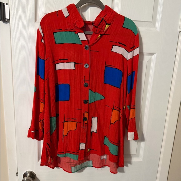 Vibrant red top with abstract multicolor patterns. Features button-up front and relaxed fit. Perfect for a bold look.