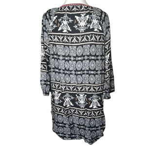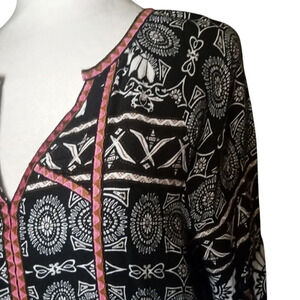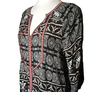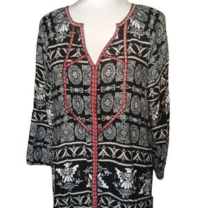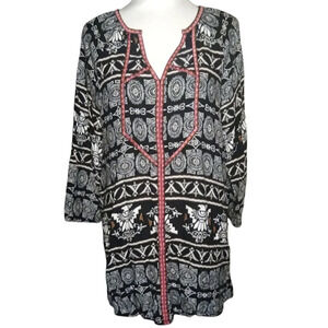 Ali Miles Southwestern Print Embroidered Split V Neck Tunic Top Size Large