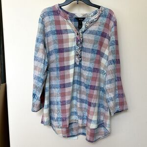 Womens 1X top pullover with buttons. Oversized boxy baggy tunic. Multicolored check pattern. No obvious flaws found. 24 pit to pit 28 front hem length