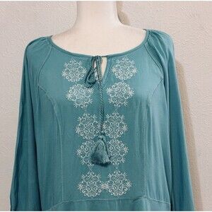 Add a touch of bohemian art to your wardrobe with this beautiful teal tassel tunic top from Ali Miles. The floral pattern and embroidered accents make it a perfect choice for travel, parties, or casual wear. The relaxed fit and puff sleeves provide comfort and style, while the scoop neck and button closure add a touch of elegance. Hand wash only, this blouse is made of a soft and comfortable blend of rayon and cotton, with a down fabric type. Articulated in China, this top is available in size L, making it a perfect fit for regular-sized women.