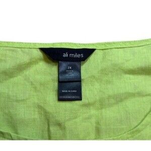 The Ali Miles Women Tunic Top Blouse in plus size 2X is a stylish and comfortable piece made from 100% linen in a solid green color. This relaxed fit blouse features a round neckline, 3/4 sleeves with a casual sleeve type, and a pullover closure with button accents. Perfect for travel, casual wear, or workwear, this tunic blouse is lightweight and suitable for all seasons. Made by Ali Miles, this versatile piece combines elements of beach, lagenlook, minimalist, classic, preppy, and modern styles, making it a must-have addition to any woman's wardrobe.