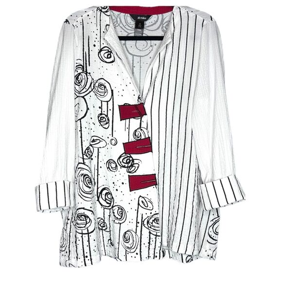 This eclectic tunic is a fun piece to make a bold statement! A combination of black and white vertical stripes and an abstract swirl/geometric print with solid red button accents.